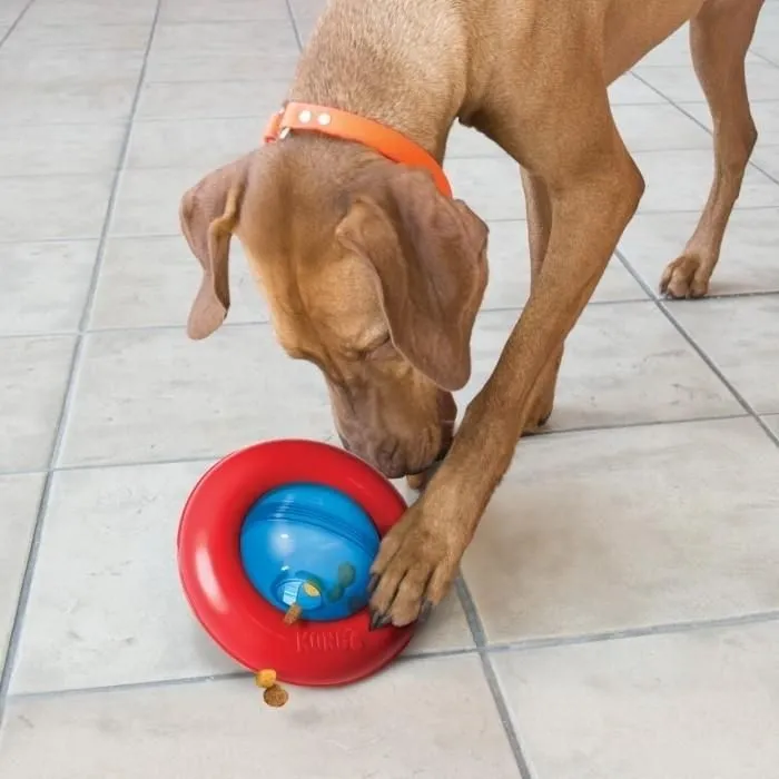 Le nouveau KONG Gyro saura divertir votre animal avec son mouvement de roulement/retournement irrésistible qui attire l’attention du chien tout en l’intriguant. Le globe central qui tourne de manière dynamique et la bague extérieure statique encouragent les chiens à pousser et à faire rouler le Gyro avec leurs pattes pour en faire sortir de délicieuses friandises. Idéal pour jouer en solo, vous pourrez le remplir de friandises ou de croquettes pour offrir à vos toutous de longues séances de jeu.