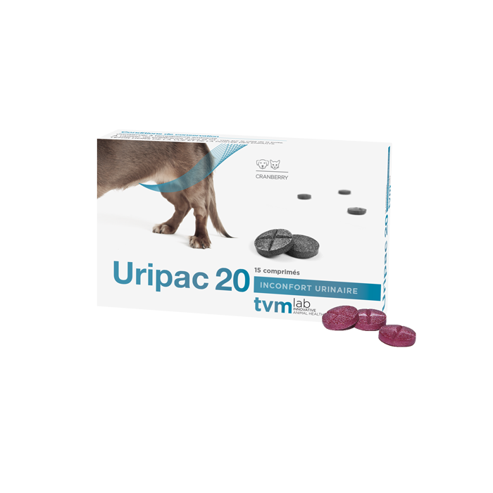 URIPAC est un aliment complémentaire pour une prise en charge simple et sûre de l’inconfort urinaire des chiens et des chats. URIPAC est un comprimé appétent à base d’extrait de Cranberry Vaccinium macrocarpon de haute qualité, dont la teneur est garantie en proanthocyanidines (PACs).Les PACs sont des tannins naturellement présents dans la Cranberry. Seules les PACs de type A ont des propriétés anti-adhésion bactérienne. Ces PACs empêchent la reconnaissance des adhésines bactériennes par les récepteurs glycoprotéiques des cellules urothéliales : les bactéries ne peuvent plus se fixer aux parois urinaires et sont alors éliminées par le flux urinaire lors de la miction.